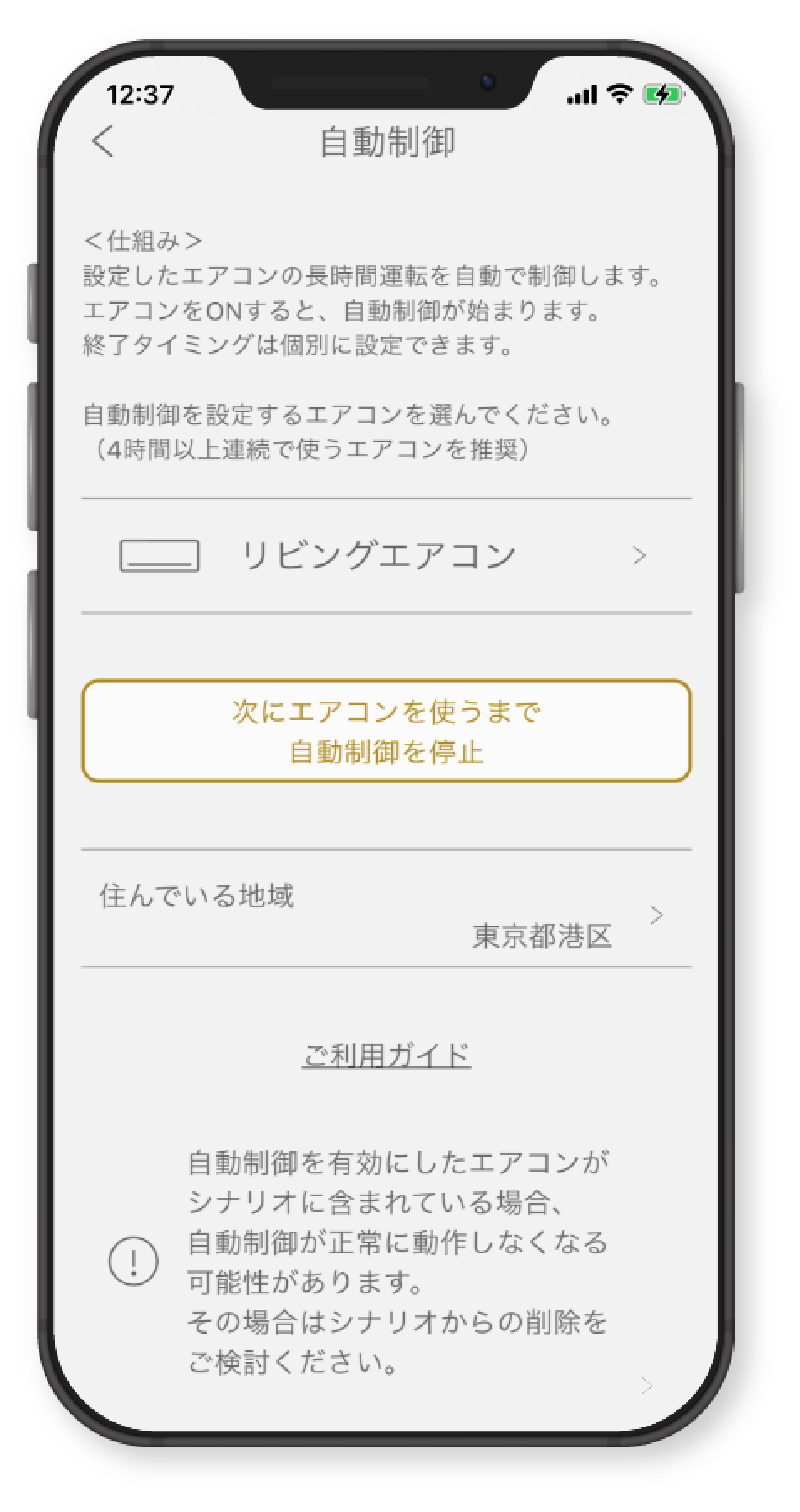 「次にエアコンを使うまで自動制御を停止」ボタンをタップすると